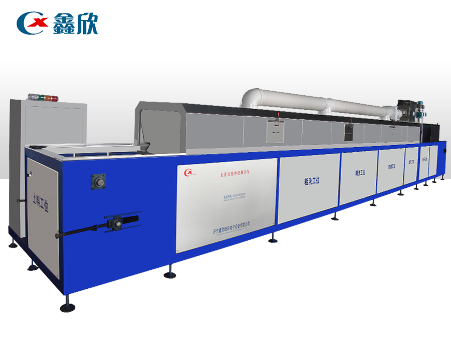 該設(shè)備有上下料網(wǎng)帶、超聲波清洗工位、噴淋漂洗工位、高壓風(fēng)切、熱風(fēng)烘干工位、溫控水加熱系統(tǒng)、風(fēng)機、溫控空氣加熱系統(tǒng)、移動式風(fēng)刀、PLC+觸摸屏控制系統(tǒng)、管路系統(tǒng)及智能電器控制系統(tǒng)等組成。自動進排液和自動加溫系統(tǒng)完全實現(xiàn)了無人干預(yù),自動運行,很大程度上降低了工人的勞動強度。先進的霧氣處理系統(tǒng)可以將清洗時產(chǎn)生的霧氣冷凝回流,空氣經(jīng)過濾和活性炭吸附后排出。
