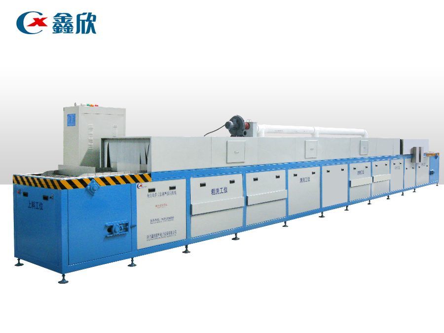 該設備有上下料網帶、超聲波清洗工位、噴淋漂洗工位、高壓風切、熱風烘干工位、溫控水加熱系統、風機、溫控空氣加熱系統、移動式風刀、PLC+觸摸屏控制系統、管路系統及智能電器控制系統等組成。自動進排液和自動加溫系統完全實現了無人干預,自動運行,很大程度上降低了工人的勞動強度。先進的霧氣處理系統可以將清洗時產生的霧氣冷凝回流,空氣經過濾和活性炭吸附后排出。