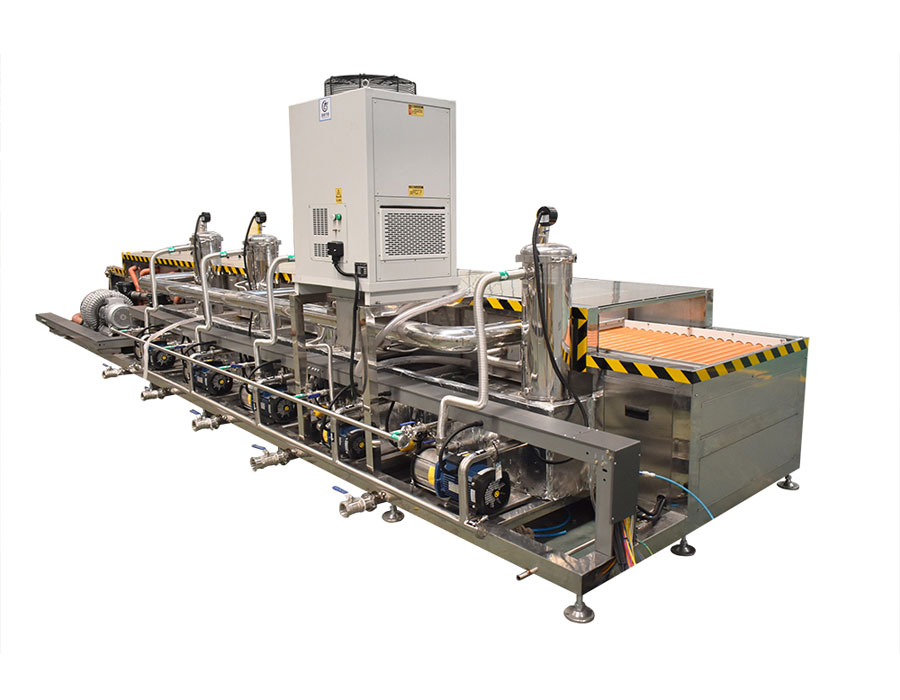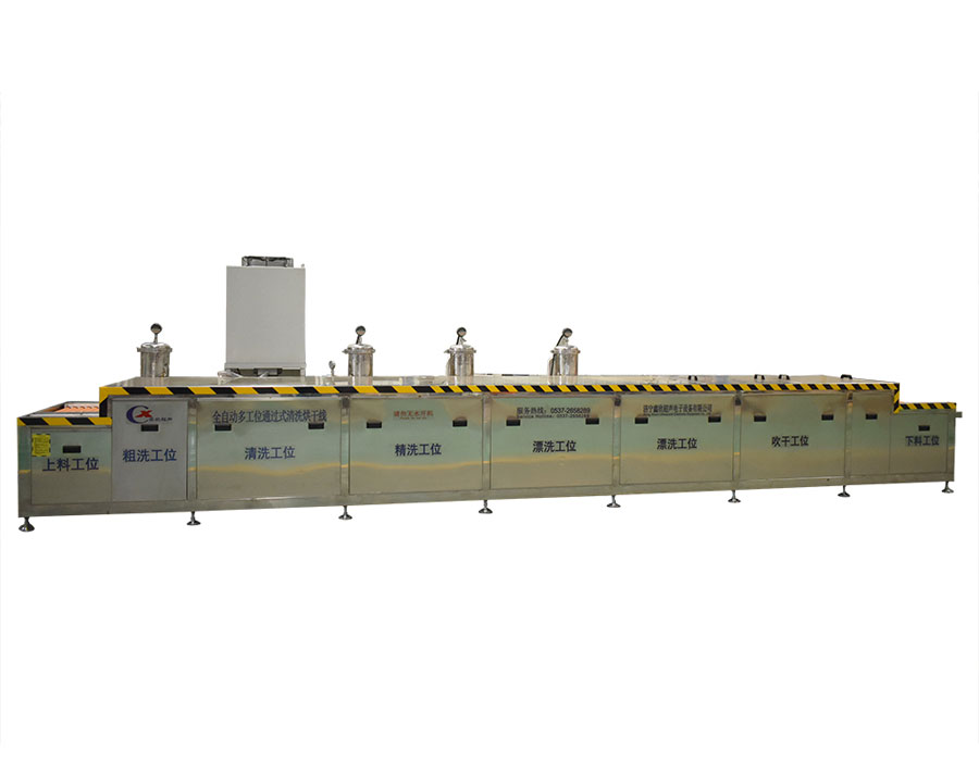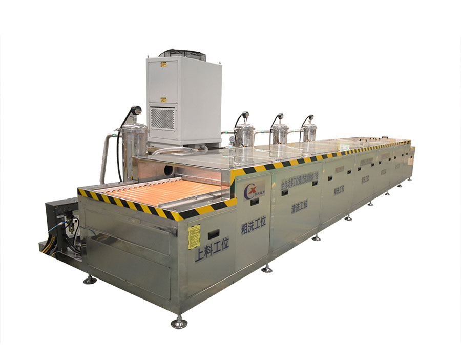 本設備為通過式玻璃清洗烘干線,清洗部分傳動形式采用專用輸送鏈條帶動,與玻璃接觸面都是橡膠包裹之后的滾筒,清洗該設備有上料滾筒線、噴淋清洗工位、毛刷清洗工位、噴淋清洗工位、超聲波清洗工位、噴淋漂洗工位、風干工位、下料滾筒線、溫控水加熱系統、溫控空氣加熱系統、PLC+觸摸屏控制系統、管路系統及智能電器控制系統等組成。該設備清洗效果好、提高了工件的清潔度。該機結構設計及工藝安排合理、自動化程度高、清洗精度高,有效解決了此類工件的清洗難題