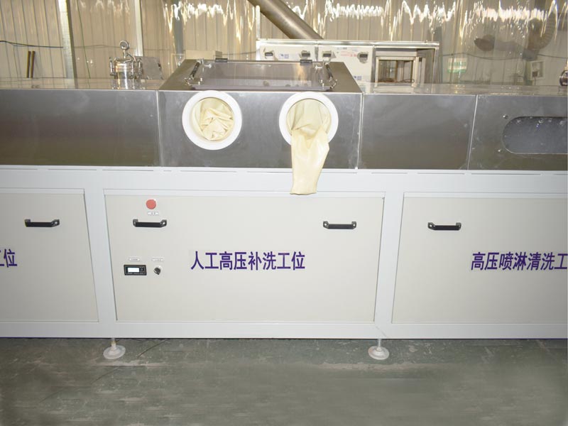 該設備為全自動高潔凈度清洗機,整機為網帶鏈條式傳動機構。采用超聲波清洗、人工高壓補洗、高壓噴淋清洗、慢拉脫水工位、高壓風切、人工補吹、干燥爐、風冷等工藝。該設備共5個工位:上料工位、超聲波清洗工位、人工高壓補洗工位、高壓噴淋清洗工位、慢拉脫水工位、高壓風切工位、人工補吹工位、干燥爐、風冷工位、下料工位。該設備清洗效果好、提高了工件的清潔度。該機結構設計及工藝安排合理、自動化程度高、清洗精度高,有效解決了此類工件的清洗難題。
